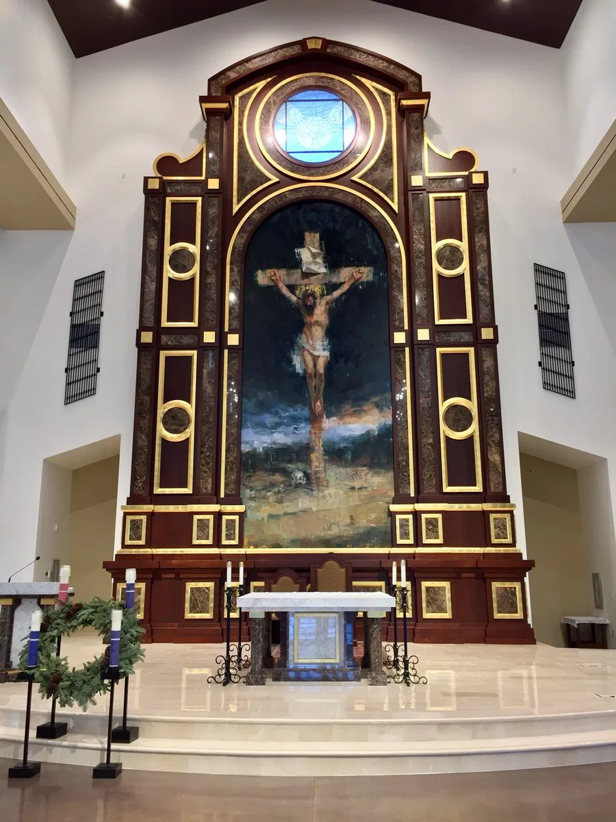 My painting of the Crucifixion was commissioned by Fr. Reynold Furrell and the parishioners of Holy Trinity Catholic Church in Ladera Ranch, CA. and completed on August 6, 2017. It can be viewed in the church, which is located at 1600 Corporate Drive, Ladera Ranch CA. 92694 Photos are courtesy of Alonso Rosado.